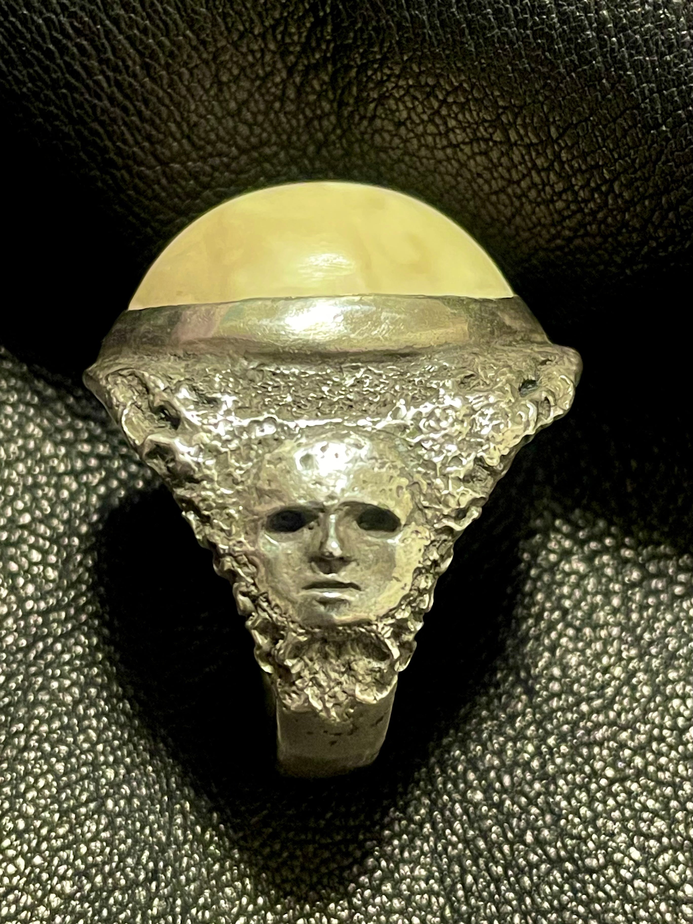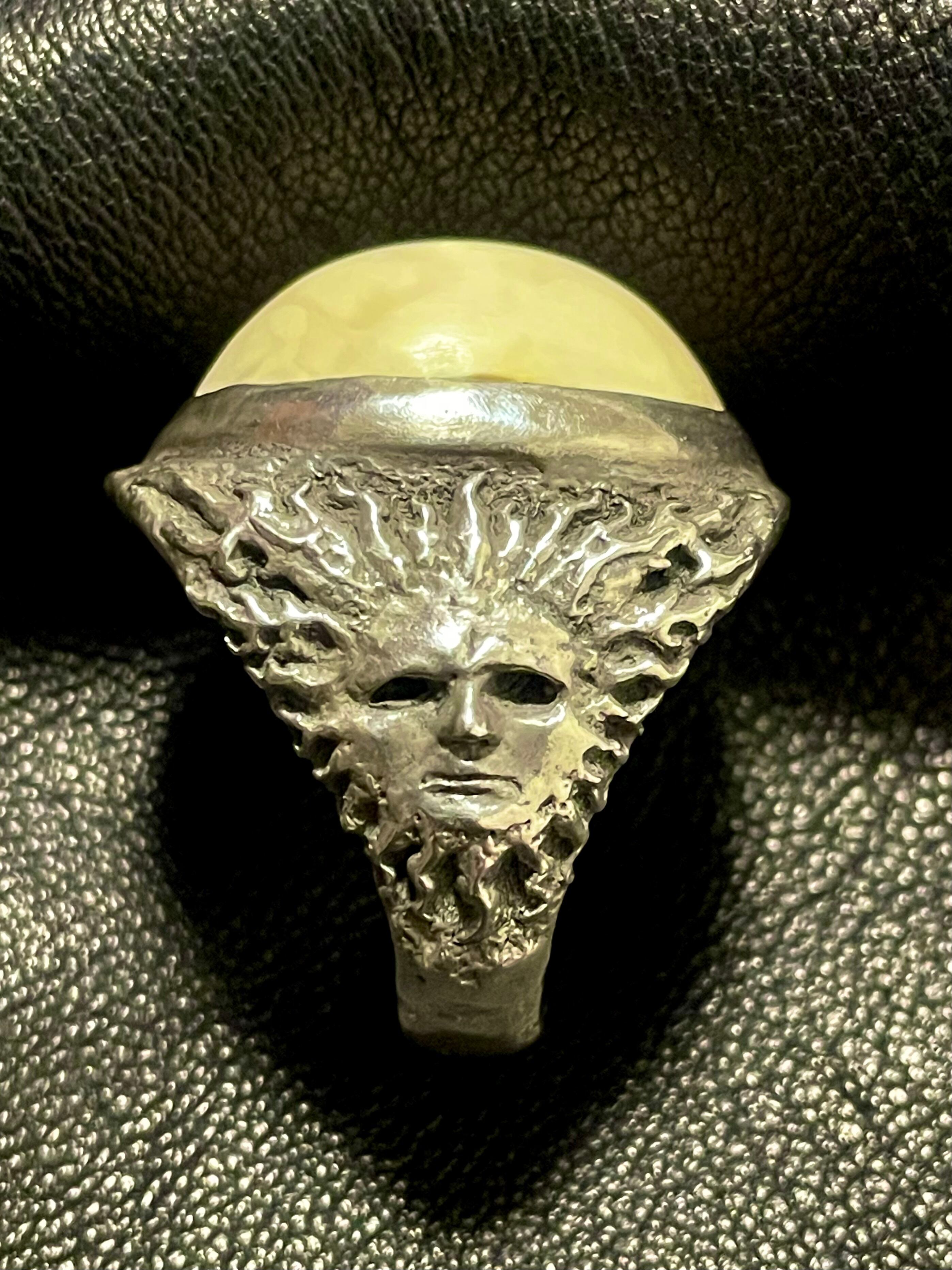 ロイヤルアンバーを使用したリングです。台座の左右には顔のある太陽と月が背中合わせに並んでいます。それらが囲む中央には数千万年前に形成された琥珀をセットしており、この組み合わせは不思議な力を意味しています。リングの裏側には魔法円がデザインされており、それはあえて未完成の状態である。
